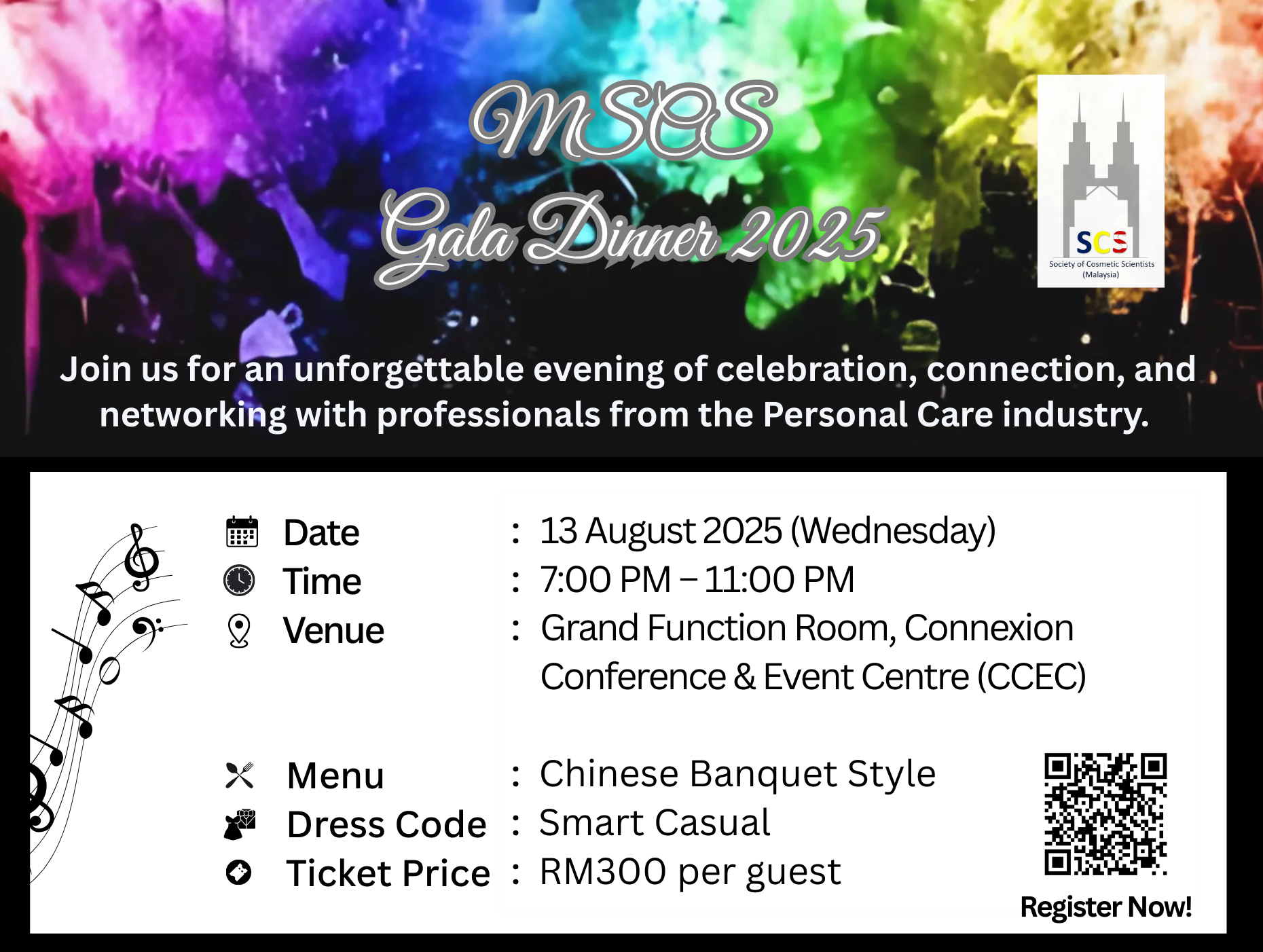 2024 was a year of both learning and growth for the Society of Cosmetic Scientists, Malaysia (MSCS). Our flagship event, the Cosmetic Industry Technology Conference (CITC) 2024, saw overwhelming participation from industry players not just from Malaysia, but from across the Asian countries. The seminar, exhibition, and networking sessions were a resounding success, fostering collaboration and innovation within our community.